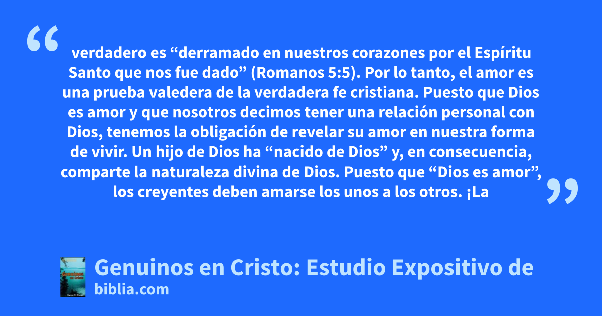 verdadero es “derramado en nuestros corazones por el Espíritu Santo que nos fue dado” (Romanos 5:5). Por lo tanto, el amor es una prueba valedera de la verdadera fe cristiana. Puesto que Dios es amor y que nosotros decimos tener una relación personal con Dios, tenemos la obligación de revelar su amor en nuestra forma de vivir. Un hijo de Dios ha “nacido de Dios” y, en consecuencia, comparte la naturaleza divina de Dios. Puesto que “Dios es amor”, los creyentes deben amarse los unos a los otros. ¡La