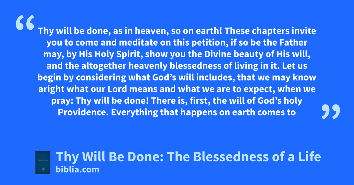 Thy will be done, as in heaven, so on earth! These chapters invite you to come and meditate on this petition, if so be the Father may, by His Holy Spirit, show you the Divine beauty of His will, and the altogether heavenly blessedness of living in it. Let us begin by considering what God’s will includes, that we may know aright what our Lord means and what we are to expect, when we pray: Thy will be done! There is, first, the will of God’s holy Providence. Everything that happens on earth comes to