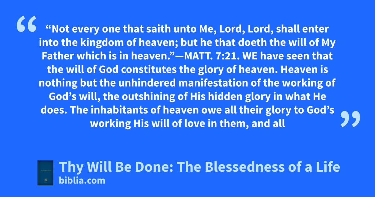 “Not every one that saith unto Me, Lord, Lord, shall enter into the kingdom of heaven; but he that doeth the will of My Father which is in heaven.”—MATT. 7:21. WE have seen that the will of God constitutes the glory of heaven. Heaven is nothing but the unhindered manifestation of the working of God’s will, the outshining of His hidden glory in what He does. The inhabitants of heaven owe all their glory to God’s working His will of love in them, and all