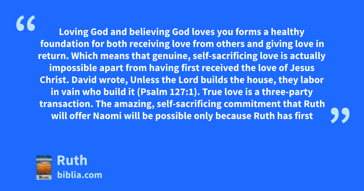 Loving God and believing God loves you forms a healthy foundation for both receiving love from others and giving love in return. Which means that genuine, self-sacrificing love is actually impossible apart from having first received the love of Jesus Christ. David wrote, Unless the Lord builds the house, they labor in vain who build it (Psalm 127:1). True love is a three-party transaction. The amazing, self-sacrificing commitment that Ruth will offer Naomi will be possible only because Ruth has first