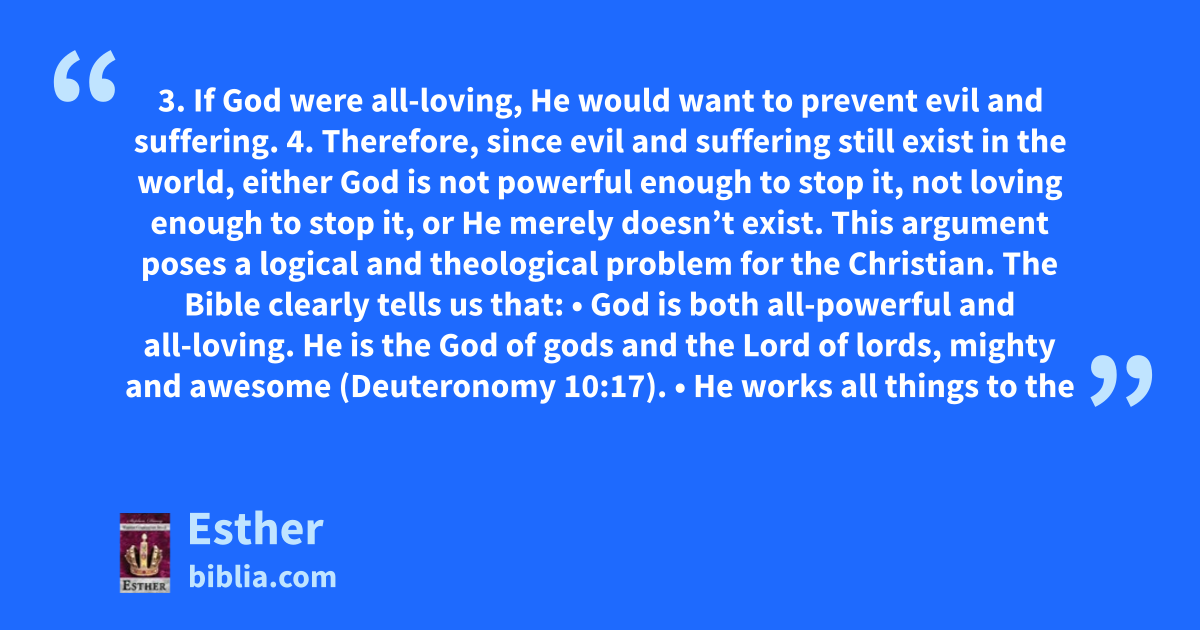 3. If God were all-loving, He would want to prevent evil and suffering. 4. Therefore, since evil and suffering still exist in the world, either God is not powerful enough to stop it, not loving enough to stop it, or He merely doesn’t exist. This argument poses a logical and theological problem for the Christian. The Bible clearly tells us that: • God is both all-powerful and all-loving. He is the God of gods and the Lord of lords, mighty and awesome (Deuteronomy 10:17). • He works all things to the
