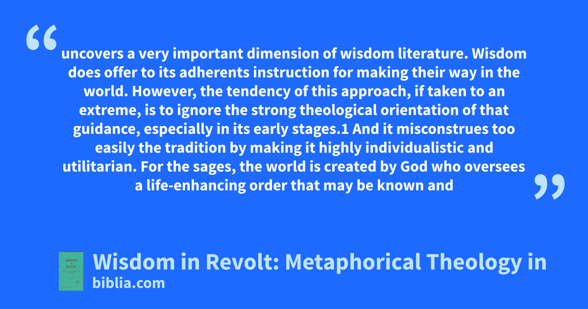 uncovers a very important dimension of wisdom literature. Wisdom does offer to its adherents instruction for making their way in the world. However, the tendency of this approach, if taken to an extreme, is to ignore the strong theological orientation of that guidance, especially in its early stages.1 And it misconstrues too easily the tradition by making it highly individualistic and utilitarian. For the sages, the world is created by God who oversees a life-enhancing order that may be known and