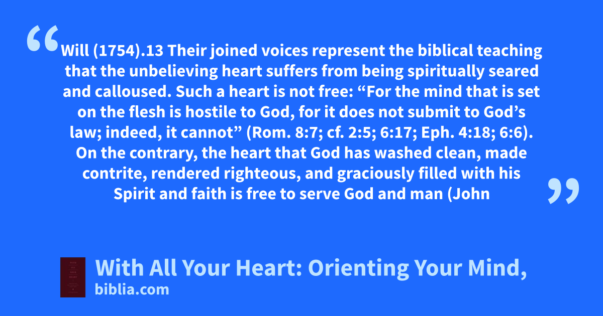 Will (1754).13 Their joined voices represent the biblical teaching that the unbelieving heart suffers from being spiritually seared and calloused. Such a heart is not free: “For the mind that is set on the flesh is hostile to God, for it does not submit to God’s law; indeed, it cannot” (Rom. 8:7; cf. 2:5; 6:17; Eph. 4:18; 6:6). On the contrary, the heart that God has washed clean, made contrite, rendered righteous, and graciously filled with his Spirit and faith is free to serve God and man (John