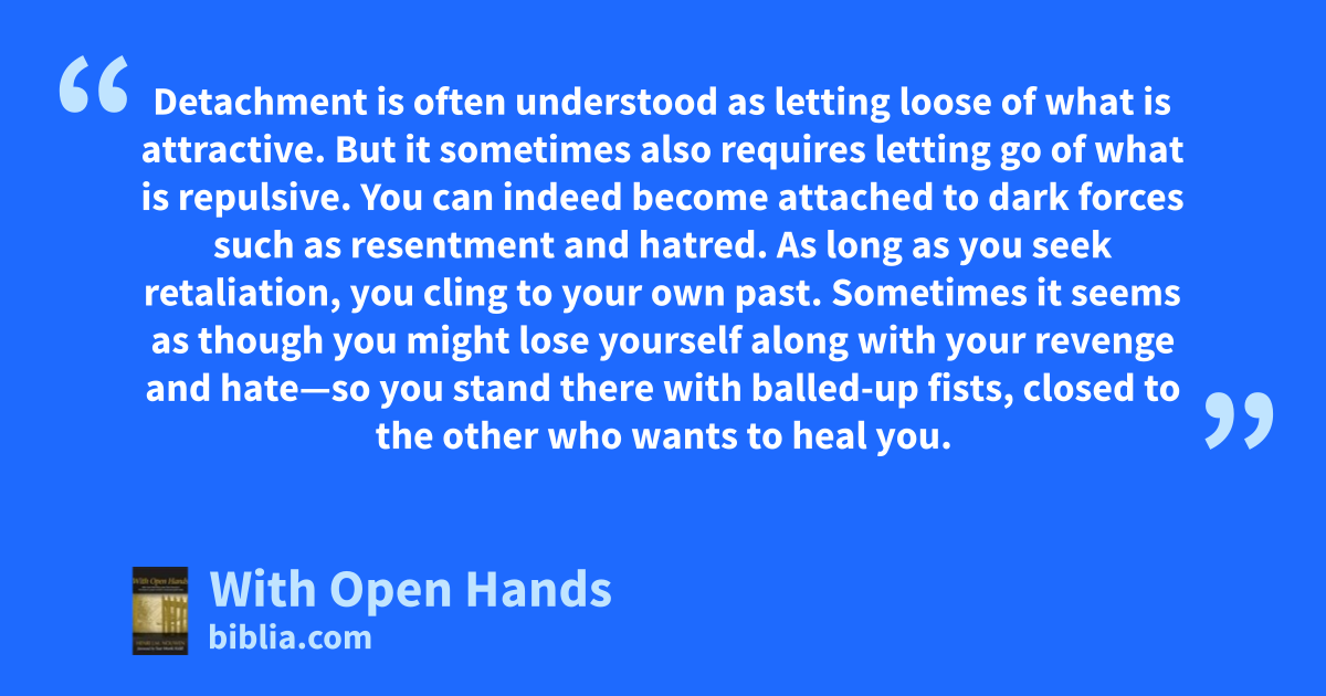 Detachment is often understood as letting loose of what is attractive. But it sometimes also requires letting go of what is repulsive. You can indeed become attached to dark forces such as resentment and hatred. As long as you seek retaliation, you cling to your own past. Sometimes it seems as though you might lose yourself along with your revenge and hate—so you stand there with balled-up fists, closed to the other who wants to heal you.