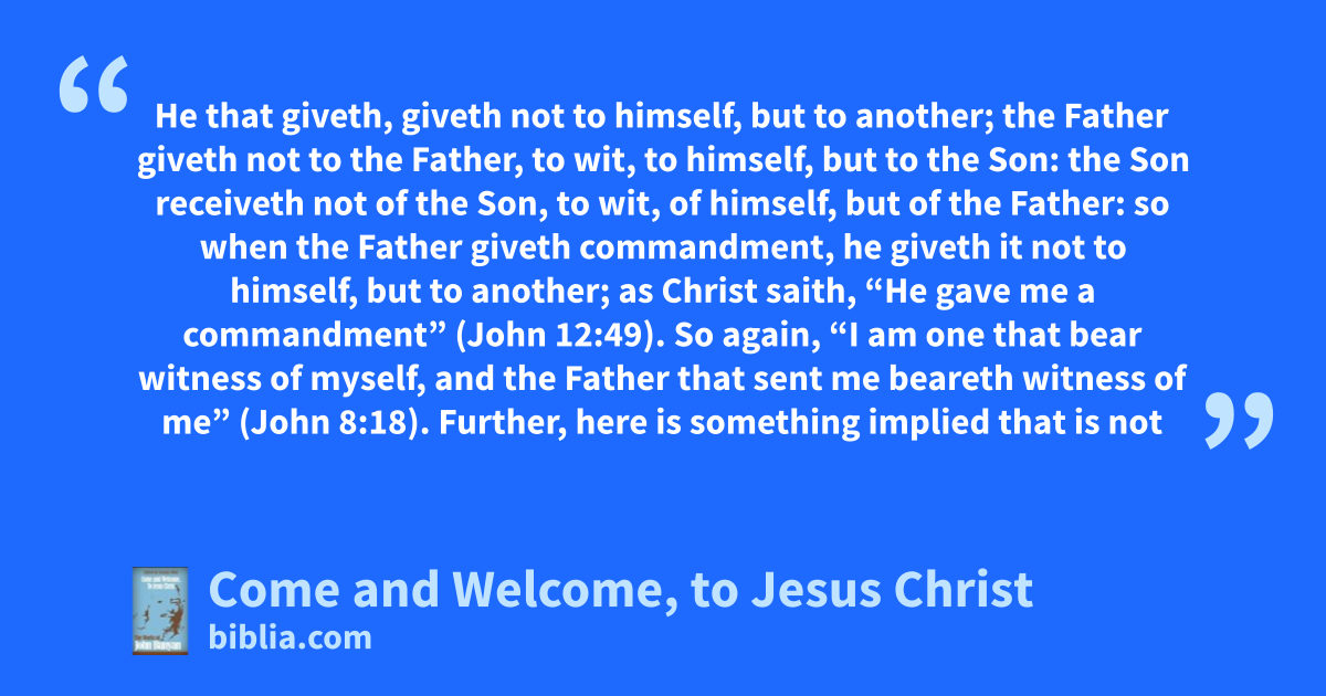 He that giveth, giveth not to himself, but to another; the Father giveth not to the Father, to wit, to himself, but to the Son: the Son receiveth not of the Son, to wit, of himself, but of the Father: so when the Father giveth commandment, he giveth it not to himself, but to another; as Christ saith, “He gave me a commandment” (John 12:49). So again, “I am one that bear witness of myself, and the Father that sent me beareth witness of me” (John 8:18). Further, here is something implied that is not