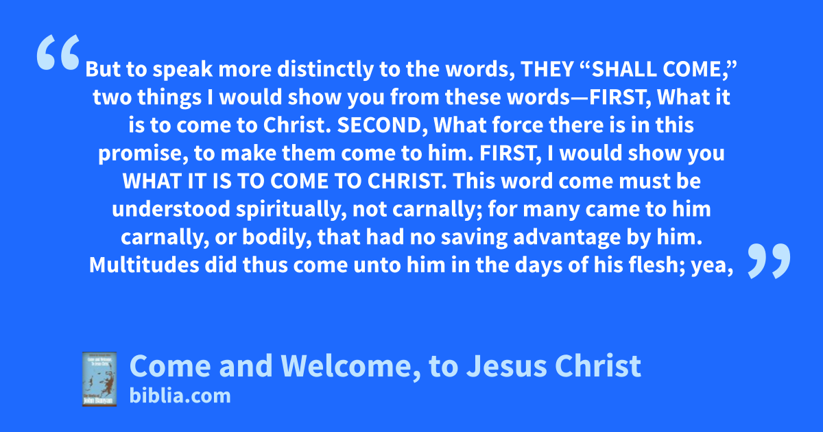 But to speak more distinctly to the words, THEY “SHALL COME,” two things I would show you from these words—FIRST, What it is to come to Christ. SECOND, What force there is in this promise, to make them come to him. FIRST, I would show you WHAT IT IS TO COME TO CHRIST. This word come must be understood spiritually, not carnally; for many came to him carnally, or bodily, that had no saving advantage by him. Multitudes did thus come unto him in the days of his flesh; yea,