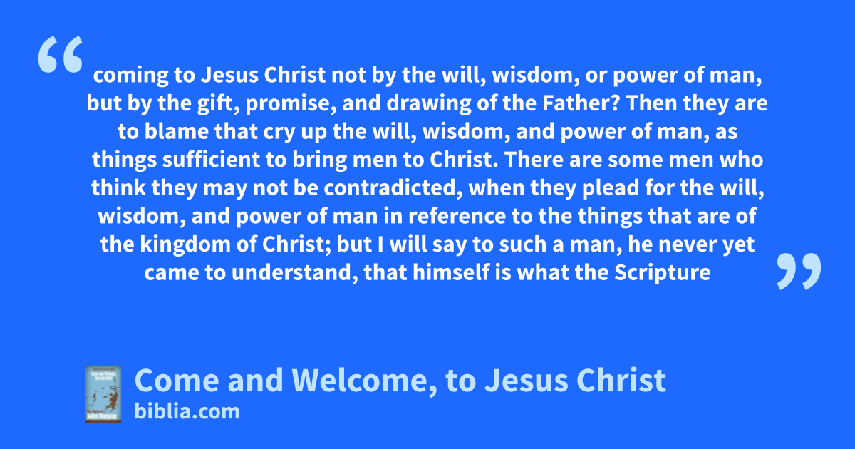 coming to Jesus Christ not by the will, wisdom, or power of man, but by the gift, promise, and drawing of the Father? Then they are to blame that cry up the will, wisdom, and power of man, as things sufficient to bring men to Christ. There are some men who think they may not be contradicted, when they plead for the will, wisdom, and power of man in reference to the things that are of the kingdom of Christ; but I will say to such a man, he never yet came to understand, that himself is what the Scripture
