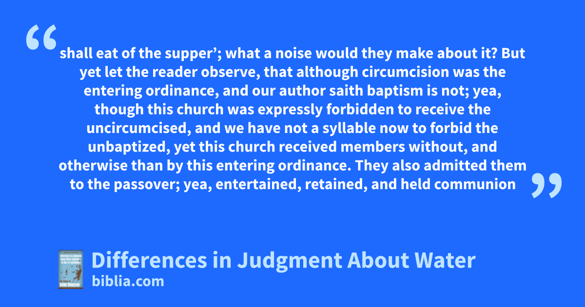 shall eat of the supper’; what a noise would they make about it? But yet let the reader observe, that although circumcision was the entering ordinance, and our author saith baptism is not; yea, though this church was expressly forbidden to receive the uncircumcised, and we have not a syllable now to forbid the unbaptized, yet this church received members without, and otherwise than by this entering ordinance. They also admitted them to the passover; yea, entertained, retained, and held communion