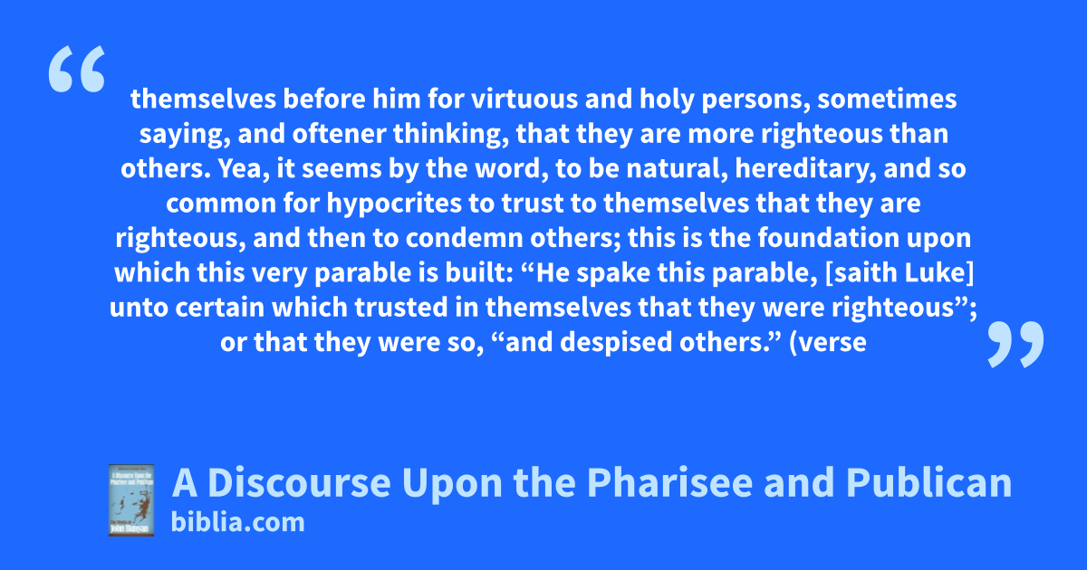 themselves before him for virtuous and holy persons, sometimes saying, and oftener thinking, that they are more righteous than others. Yea, it seems by the word, to be natural, hereditary, and so common for hypocrites to trust to themselves that they are righteous, and then to condemn others; this is the foundation upon which this very parable is built: “He spake this parable, [saith Luke] unto certain which trusted in themselves that they were righteous”; or that they were so, “and despised others.” (verse