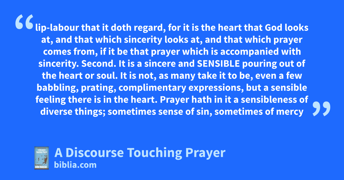 lip-labour that it doth regard, for it is the heart that God looks at, and that which sincerity looks at, and that which prayer comes from, if it be that prayer which is accompanied with sincerity. Second. It is a sincere and SENSIBLE pouring out of the heart or soul. It is not, as many take it to be, even a few babbling, prating, complimentary expressions, but a sensible feeling there is in the heart. Prayer hath in it a sensibleness of diverse things; sometimes sense of sin, sometimes of mercy