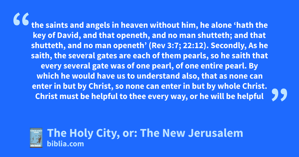 The inspiration for this work came from a meditation John Bunyan gave to fellow inmates one Sunday during his 12-year imprisonment. In it, Bunyan dwells on St. John's glorious vision of the New Jerusalem as recorded in Revelation 21 and finds hope and encouragement for all believers.