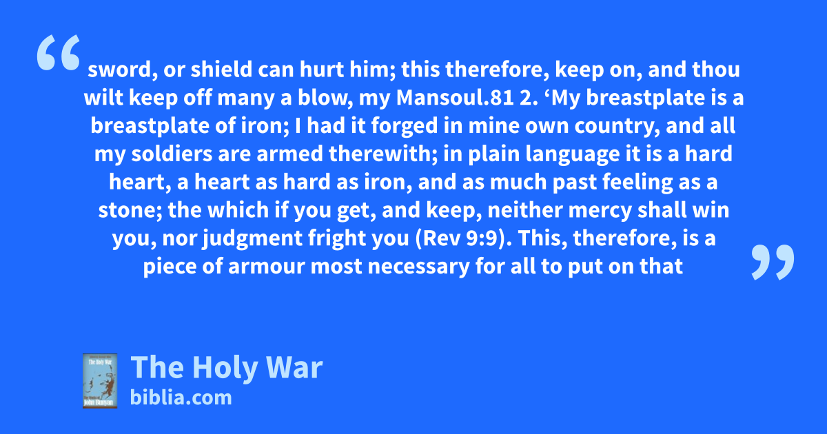 In this work, "...Man's soul is figured under the simile of a town, which having surrendered to an insidious and mortal enemy, is besieged by its lawful Sovereign with all the 'pomp and circumstances' of war; the arch-enemy is driven out, the town retaken, new-modelled, and garrisoned by Emmanuel." The editor, George Offor, calls it an "extraordinary book, manifesting a degree of genius,...