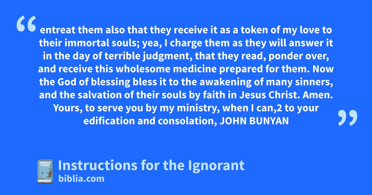 entreat them also that they receive it as a token of my love to their immortal souls; yea, I charge them as they will answer it in the day of terrible judgment, that they read, ponder over, and receive this wholesome medicine prepared for them. Now the God of blessing bless it to the awakening of many sinners, and the salvation of their souls by faith in Jesus Christ. Amen. Yours, to serve you by my ministry, when I can,2 to your edification and consolation, JOHN BUNYAN