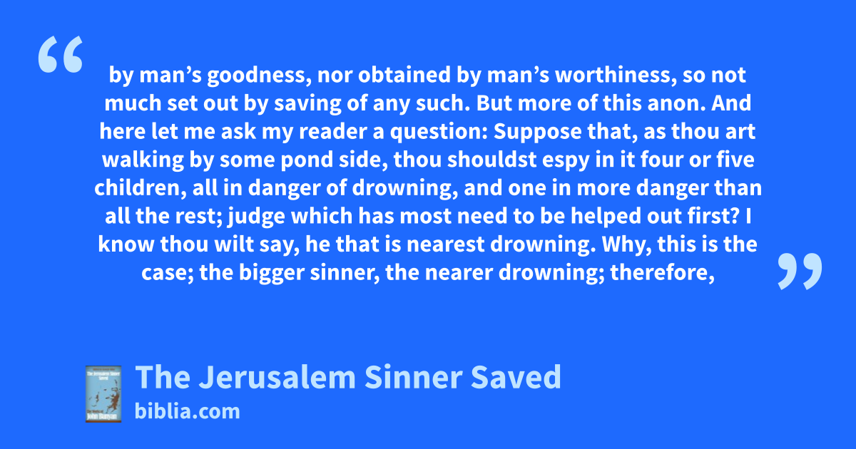 by man’s goodness, nor obtained by man’s worthiness, so not much set out by saving of any such. But more of this anon. And here let me ask my reader a question: Suppose that, as thou art walking by some pond side, thou shouldst espy in it four or five children, all in danger of drowning, and one in more danger than all the rest; judge which has most need to be helped out first? I know thou wilt say, he that is nearest drowning. Why, this is the case; the bigger sinner, the nearer drowning; therefore,