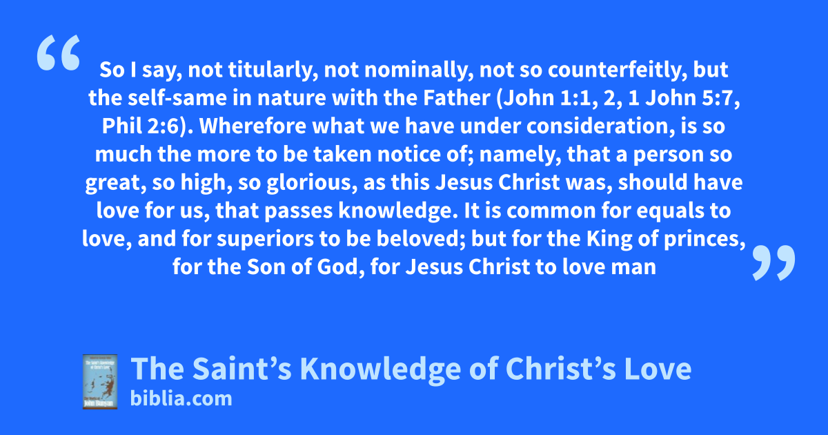 So I say, not titularly, not nominally, not so counterfeitly, but the self-same in nature with the Father (John 1:1, 2, 1 John 5:7, Phil 2:6). Wherefore what we have under consideration, is so much the more to be taken notice of; namely, that a person so great, so high, so glorious, as this Jesus Christ was, should have love for us, that passes knowledge. It is common for equals to love, and for superiors to be beloved; but for the King of princes, for the Son of God, for Jesus Christ to love man