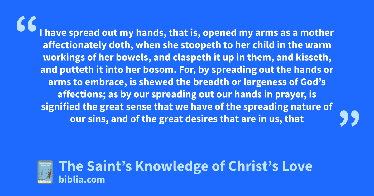 I have spread out my hands, that is, opened my arms as a mother affectionately doth, when she stoopeth to her child in the warm workings of her bowels, and claspeth it up in them, and kisseth, and putteth it into her bosom. For, by spreading out the hands or arms to embrace, is shewed the breadth or largeness of God’s affections; as by our spreading out our hands in prayer, is signified the great sense that we have of the spreading nature of our sins, and of the great desires that are in us, that