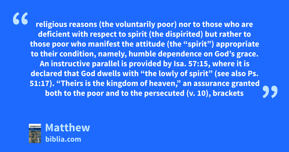 religious reasons (the voluntarily poor) nor to those who are deficient with respect to spirit (the dispirited) but rather to those poor who manifest the attitude (the “spirit”) appropriate to their condition, namely, humble dependence on God’s grace. An instructive parallel is provided by Isa. 57:15, where it is declared that God dwells with “the lowly of spirit” (see also Ps. 51:17). “Theirs is the kingdom of heaven,” an assurance granted both to the poor and to the persecuted (v. 10), brackets