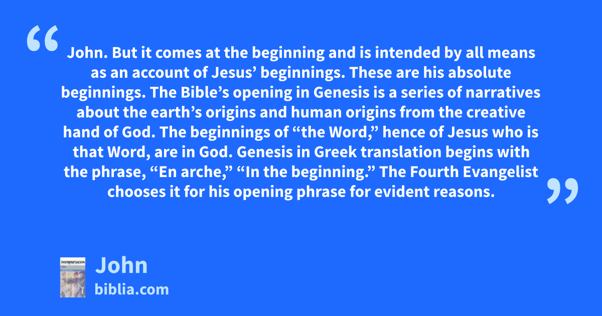John. But it comes at the beginning and is intended by all means as an account of Jesus’ beginnings. These are his absolute beginnings. The Bible’s opening in Genesis is a series of narratives about the earth’s origins and human origins from the creative hand of God. The beginnings of “the Word,” hence of Jesus who is that Word, are in God. Genesis in Greek translation begins with the phrase, “En arche,” “In the beginning.” The Fourth Evangelist chooses it for his opening phrase for evident reasons.