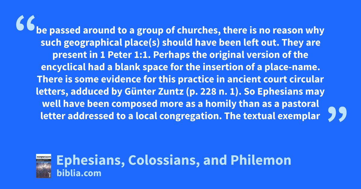 be passed around to a group of churches, there is no reason why such geographical place(s) should have been left out. They are present in 1 Peter 1:1. Perhaps the original version of the encyclical had a blank space for the insertion of a place-name. There is some evidence for this practice in ancient court circular letters, adduced by Günter Zuntz (p. 228 n. 1). So Ephesians may well have been composed more as a homily than as a pastoral letter addressed to a local congregation. The textual exemplar