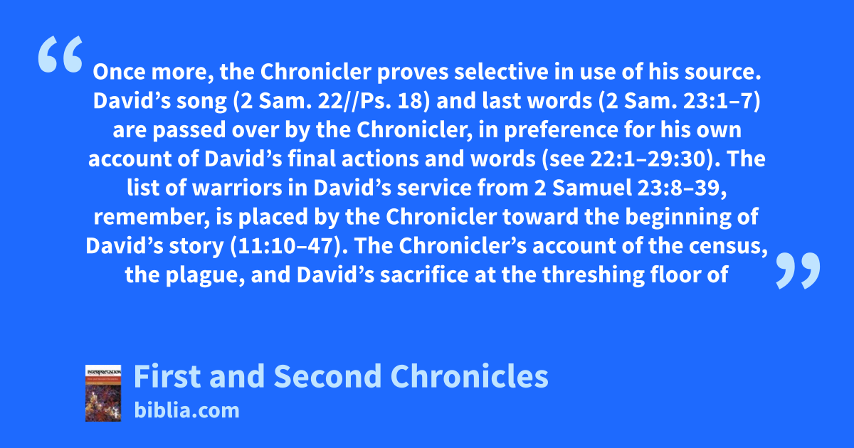 Once more, the Chronicler proves selective in use of his source. David’s song (2 Sam. 22//Ps. 18) and last words (2 Sam. 23:1–7) are passed over by the Chronicler, in preference for his own account of David’s final actions and words (see 22:1–29:30). The list of warriors in David’s service from 2 Samuel 23:8–39, remember, is placed by the Chronicler toward the beginning of David’s story (11:10–47). The Chronicler’s account of the census, the plague, and David’s sacrifice at the threshing floor of