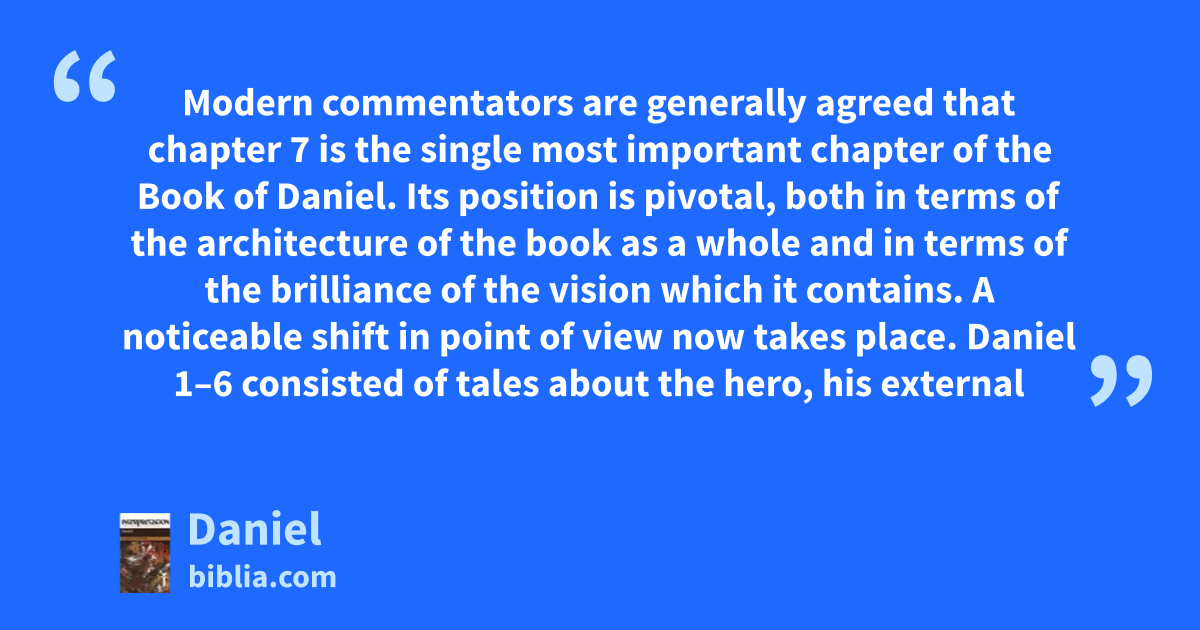 Modern commentators are generally agreed that chapter 7 is the single most important chapter of the Book of Daniel. Its position is pivotal, both in terms of the architecture of the book as a whole and in terms of the brilliance of the vision which it contains. A noticeable shift in point of view now takes place. Daniel 1–6 consisted of tales about the hero, his external