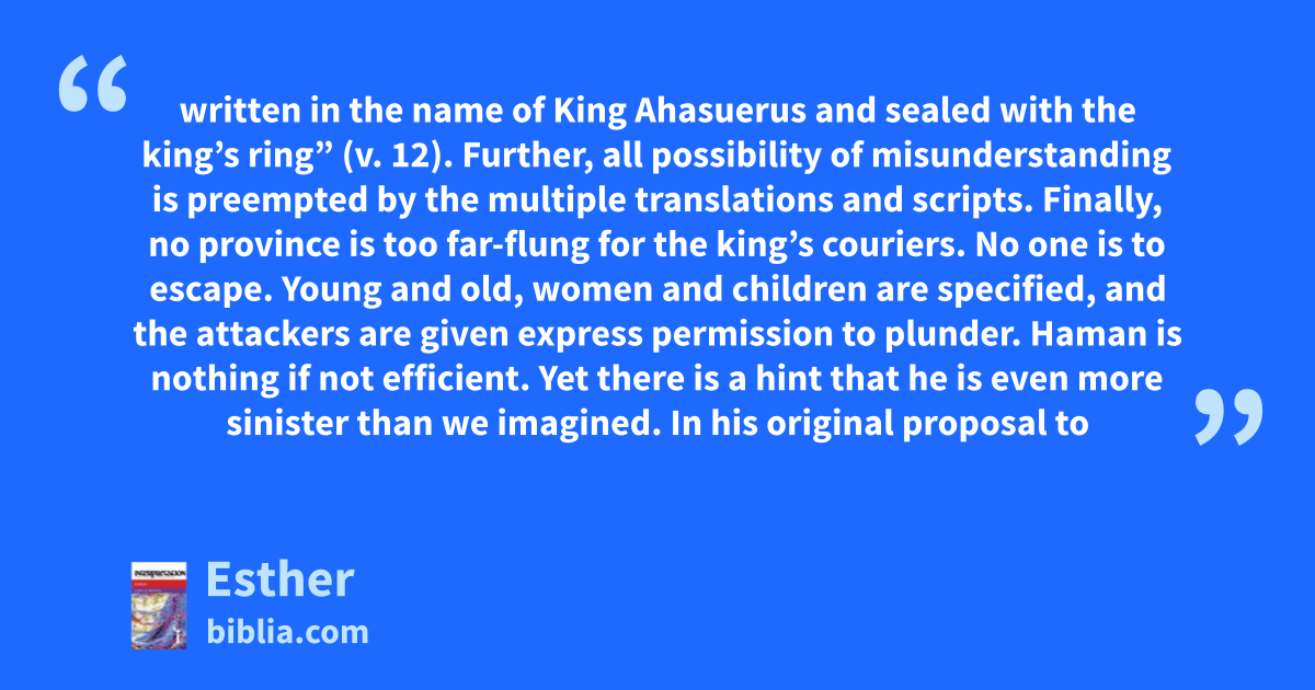 written in the name of King Ahasuerus and sealed with the king’s ring” (v. 12). Further, all possibility of misunderstanding is preempted by the multiple translations and scripts. Finally, no province is too far-flung for the king’s couriers. No one is to escape. Young and old, women and children are specified, and the attackers are given express permission to plunder. Haman is nothing if not efficient. Yet there is a hint that he is even more sinister than we imagined. In his original proposal to