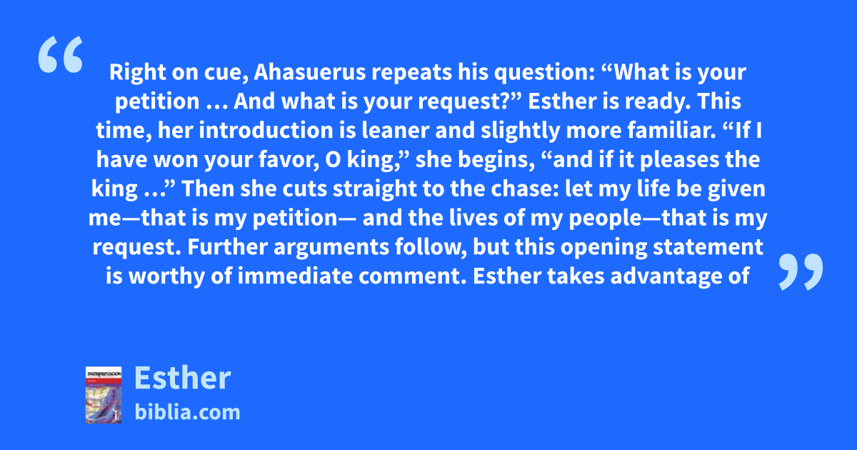Right on cue, Ahasuerus repeats his question: “What is your petition … And what is your request?” Esther is ready. This time, her introduction is leaner and slightly more familiar. “If I have won your favor, O king,” she begins, “and if it pleases the king …” Then she cuts straight to the chase: let my life be given me—that is my petition— and the lives of my people—that is my request. Further arguments follow, but this opening statement is worthy of immediate comment. Esther takes advantage of