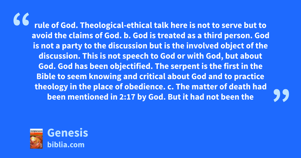 rule of God. Theological-ethical talk here is not to serve but to avoid the claims of God. b. God is treated as a third person. God is not a party to the discussion but is the involved object of the discussion. This is not speech to God or with God, but about God. God has been objectified. The serpent is the first in the Bible to seem knowing and critical about God and to practice theology in the place of obedience. c. The matter of death had been mentioned in 2:17 by God. But it had not been the