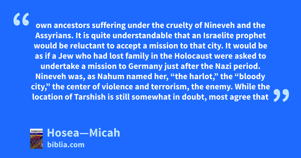 own ancestors suffering under the cruelty of Nineveh and the Assyrians. It is quite understandable that an Israelite prophet would be reluctant to accept a mission to that city. It would be as if a Jew who had lost family in the Holocaust were asked to undertake a mission to Germany just after the Nazi period. Nineveh was, as Nahum named her, “the harlot,” the “bloody city,” the center of violence and terrorism, the enemy. While the location of Tarshish is still somewhat in doubt, most agree that