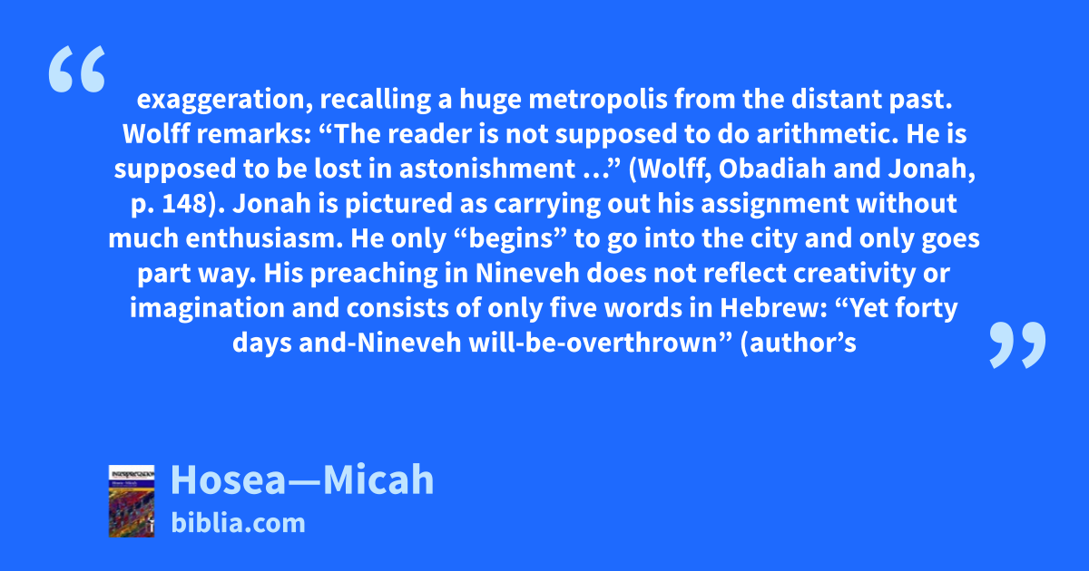 exaggeration, recalling a huge metropolis from the distant past. Wolff remarks: “The reader is not supposed to do arithmetic. He is supposed to be lost in astonishment …” (Wolff, Obadiah and Jonah, p. 148). Jonah is pictured as carrying out his assignment without much enthusiasm. He only “begins” to go into the city and only goes part way. His preaching in Nineveh does not reflect creativity or imagination and consists of only five words in Hebrew: “Yet forty days and-Nineveh will-be-overthrown” (author’s