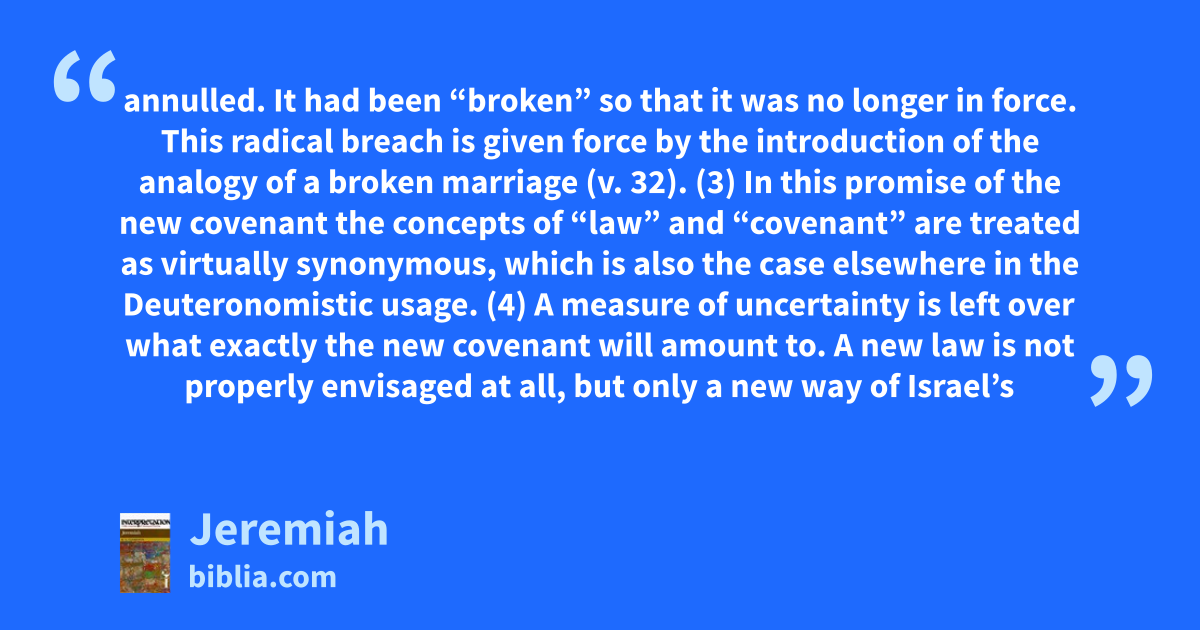 annulled. It had been “broken” so that it was no longer in force. This radical breach is given force by the introduction of the analogy of a broken marriage (v. 32). (3) In this promise of the new covenant the concepts of “law” and “covenant” are treated as virtually synonymous, which is also the case elsewhere in the Deuteronomistic usage. (4) A measure of uncertainty is left over what exactly the new covenant will amount to. A new law is not properly envisaged at all, but only a new way of Israel’s