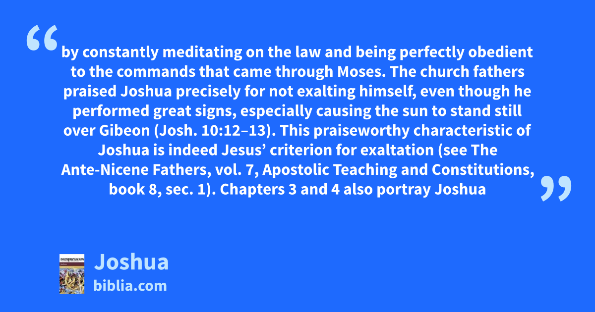 by constantly meditating on the law and being perfectly obedient to the commands that came through Moses. The church fathers praised Joshua precisely for not exalting himself, even though he performed great signs, especially causing the sun to stand still over Gibeon (Josh. 10:12–13). This praiseworthy characteristic of Joshua is indeed Jesus’ criterion for exaltation (see The Ante-Nicene Fathers, vol. 7, Apostolic Teaching and Constitutions, book 8, sec. 1). Chapters 3 and 4 also portray Joshua