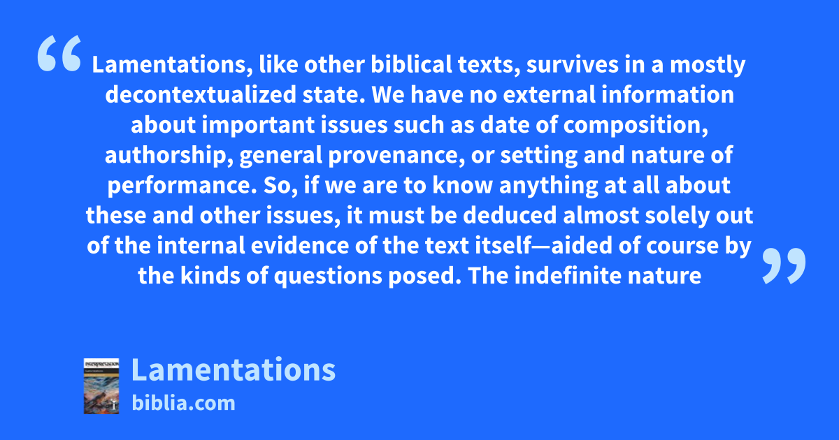Lamentations, like other biblical texts, survives in a mostly decontextualized state. We have no external information about important issues such as date of composition, authorship, general provenance, or setting and nature of performance. So, if we are to know anything at all about these and other issues, it must be deduced almost solely out of the internal evidence of the text itself—aided of course by the kinds of questions posed. The indefinite nature