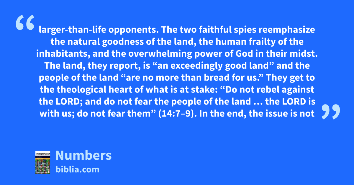 larger-than-life opponents. The two faithful spies reemphasize the natural goodness of the land, the human frailty of the inhabitants, and the overwhelming power of God in their midst. The land, they report, is “an exceedingly good land” and the people of the land “are no more than bread for us.” They get to the theological heart of what is at stake: “Do not rebel against the LORD; and do not fear the people of the land … the LORD is with us; do not fear them” (14:7–9). In the end, the issue is not