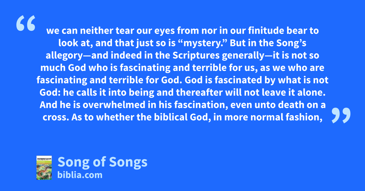 we can neither tear our eyes from nor in our finitude bear to look at, and that just so is “mystery.” But in the Song’s allegory—and indeed in the Scriptures generally—it is not so much God who is fascinating and terrible for us, as we who are fascinating and terrible for God. God is fascinated by what is not God: he calls it into being and thereafter will not leave it alone. And he is overwhelmed in his fascination, even unto death on a cross. As to whether the biblical God, in more normal fashion,