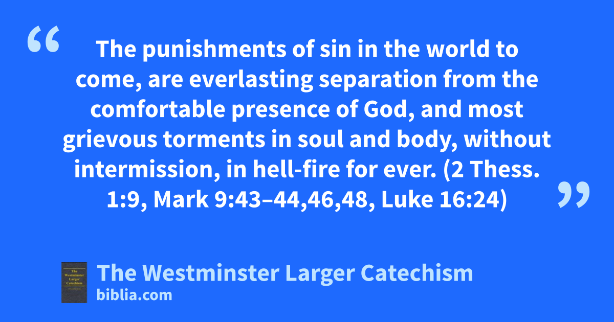 The punishments of sin in the world to come, are everlasting separation from the comfortable presence of God, and most grievous torments in soul and body, without intermission, in hell-fire for ever. (2 Thess. 1:9, Mark 9:43–44,46,48, Luke 16:24)