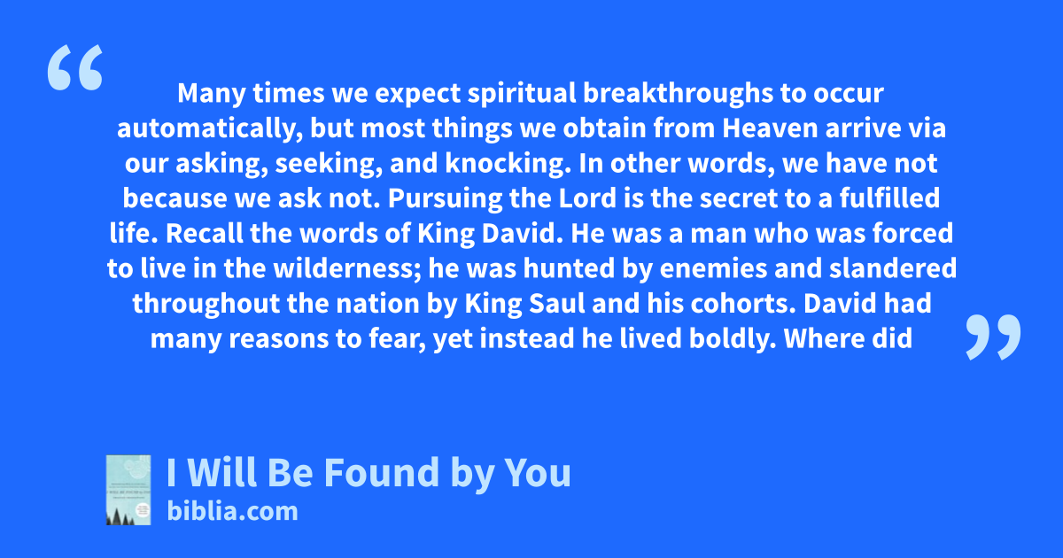 Many times we expect spiritual breakthroughs to occur automatically, but most things we obtain from Heaven arrive via our asking, seeking, and knocking. In other words, we have not because we ask not. Pursuing the Lord is the secret to a fulfilled life. Recall the words of King David. He was a man who was forced to live in the wilderness; he was hunted by enemies and slandered throughout the nation by King Saul and his cohorts. David had many reasons to fear, yet instead he lived boldly. Where did