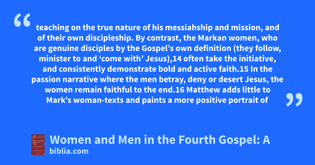 teaching on the true nature of his messiahship and mission, and of their own discipleship. By contrast, the Markan women, who are genuine disciples by the Gospel’s own definition (they follow, minister to and ‘come with’ Jesus),14 often take the initiative, and consistently demonstrate bold and active faith.15 In the passion narrative where the men betray, deny or desert Jesus, the women remain faithful to the end.16 Matthew adds little to Mark’s woman-texts and paints a more positive portrait of