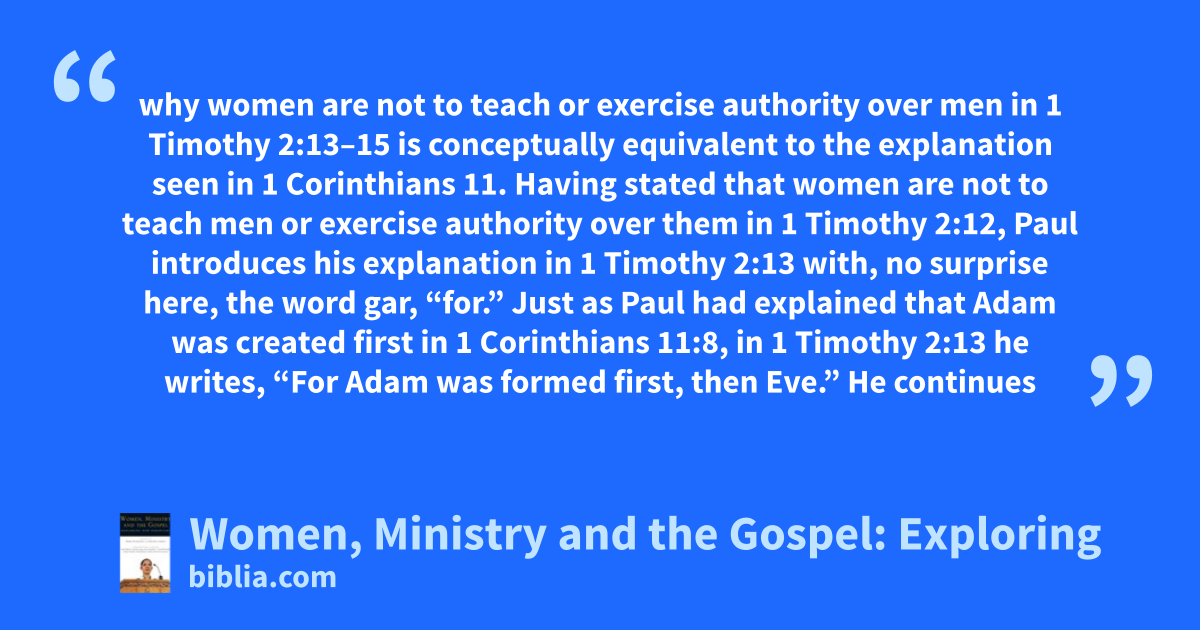 why women are not to teach or exercise authority over men in 1 Timothy 2:13–15 is conceptually equivalent to the explanation seen in 1 Corinthians 11. Having stated that women are not to teach men or exercise authority over them in 1 Timothy 2:12, Paul introduces his explanation in 1 Timothy 2:13 with, no surprise here, the word gar, “for.” Just as Paul had explained that Adam was created first in 1 Corinthians 11:8, in 1 Timothy 2:13 he writes, “For Adam was formed first, then Eve.” He continues