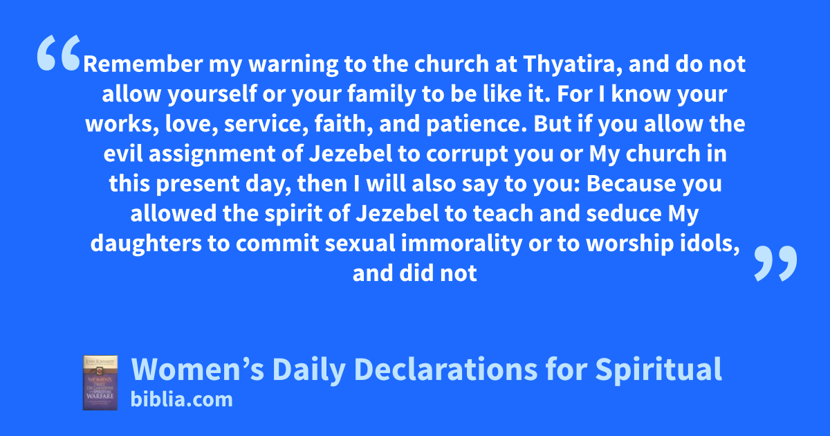 Remember my warning to the church at Thyatira, and do not allow yourself or your family to be like it. For I know your works, love, service, faith, and patience. But if you allow the evil assignment of Jezebel to corrupt you or My church in this present day, then I will also say to you: Because you allowed the spirit of Jezebel to teach and seduce My daughters to commit sexual immorality or to worship idols, and did not