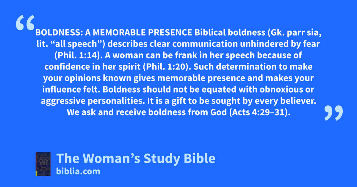 BOLDNESS: A MEMORABLE PRESENCE Biblical boldness (Gk. parr sia, lit. “all speech”) describes clear communication unhindered by fear (Phil. 1:14). A woman can be frank in her speech because of confidence in her spirit (Phil. 1:20). Such determination to make your opinions known gives memorable presence and makes your influence felt. Boldness should not be equated with obnoxious or aggressive personalities. It is a gift to be sought by every believer. We ask and receive boldness from God (Acts 4:29–31).