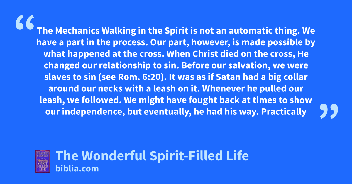 The Mechanics Walking in the Spirit is not an automatic thing. We have a part in the process. Our part, however, is made possible by what happened at the cross. When Christ died on the cross, He changed our relationship to sin. Before our salvation, we were slaves to sin (see Rom. 6:20). It was as if Satan had a big collar around our necks with a leash on it. Whenever he pulled our leash, we followed. We might have fought back at times to show our independence, but eventually, he had his way. Practically
