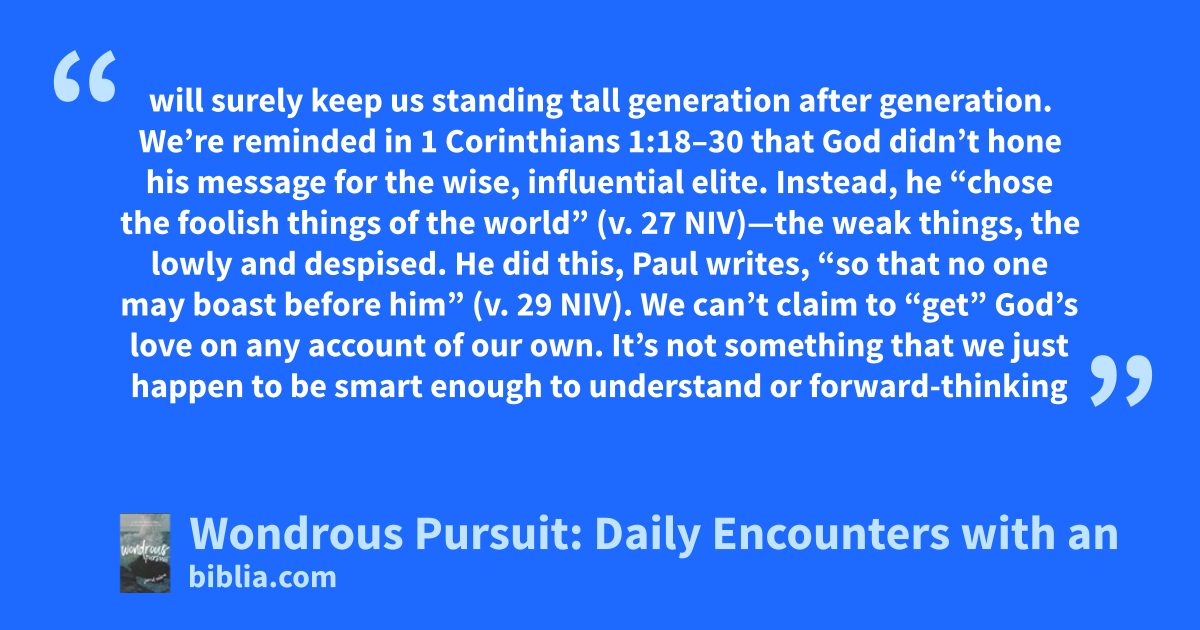 will surely keep us standing tall generation after generation. We’re reminded in 1 Corinthians 1:18–30 that God didn’t hone his message for the wise, influential elite. Instead, he “chose the foolish things of the world” (v. 27 NIV)—the weak things, the lowly and despised. He did this, Paul writes, “so that no one may boast before him” (v. 29 NIV). We can’t claim to “get” God’s love on any account of our own. It’s not something that we just happen to be smart enough to understand or forward-thinking