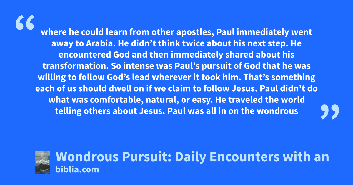 where he could learn from other apostles, Paul immediately went away to Arabia. He didn’t think twice about his next step. He encountered God and then immediately shared about his transformation. So intense was Paul’s pursuit of God that he was willing to follow God’s lead wherever it took him. That’s something each of us should dwell on if we claim to follow Jesus. Paul didn’t do what was comfortable, natural, or easy. He traveled the world telling others about Jesus. Paul was all in on the wondrous