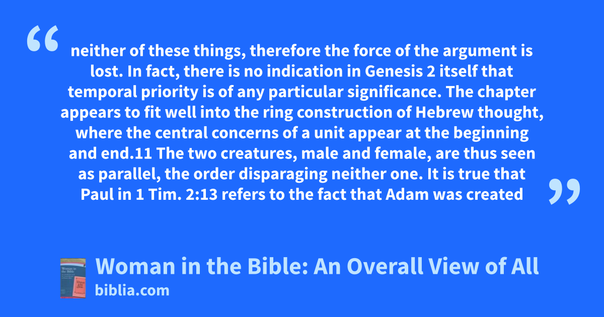 neither of these things, therefore the force of the argument is lost. In fact, there is no indication in Genesis 2 itself that temporal priority is of any particular significance. The chapter appears to fit well into the ring construction of Hebrew thought, where the central concerns of a unit appear at the beginning and end.11 The two creatures, male and female, are thus seen as parallel, the order disparaging neither one. It is true that Paul in 1 Tim. 2:13 refers to the fact that Adam was created