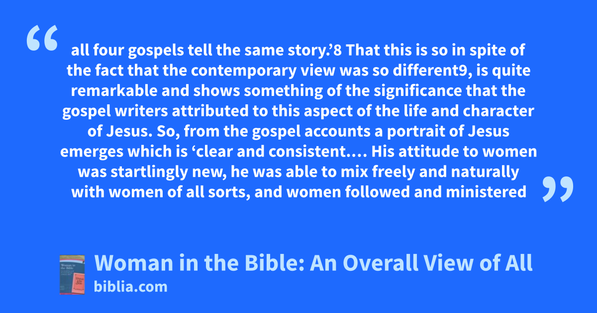 all four gospels tell the same story.’8 That this is so in spite of the fact that the contemporary view was so different9, is quite remarkable and shows something of the significance that the gospel writers attributed to this aspect of the life and character of Jesus. So, from the gospel accounts a portrait of Jesus emerges which is ‘clear and consistent.… His attitude to women was startlingly new, he was able to mix freely and naturally with women of all sorts, and women followed and ministered