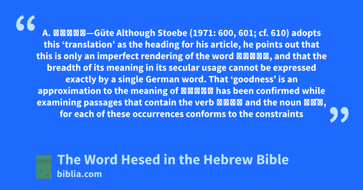 A. חֶסֶד—Güte Although Stoebe (1971: 600, 601; cf. 610) adopts this ‘translation’ as the heading for his article, he points out that this is only an imperfect rendering of the word חֶסֶד, and that the breadth of its meaning in its secular usage cannot be expressed exactly by a single German word. That ‘goodness’ is an approximation to the meaning of חֶסֶד has been confirmed while examining passages that contain the verb עשׂה and the noun טו̇ב, for each of these occurrences conforms to the constraints