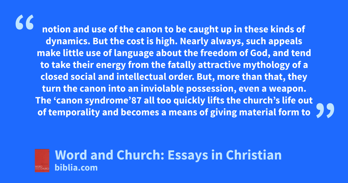 notion and use of the canon to be caught up in these kinds of dynamics. But the cost is high. Nearly always, such appeals make little use of language about the freedom of God, and tend to take their energy from the fatally attractive mythology of a closed social and intellectual order. But, more than that, they turn the canon into an inviolable possession, even a weapon. The ‘canon syndrome’87 all too quickly lifts the church’s life out of temporality and becomes a means of giving material form to