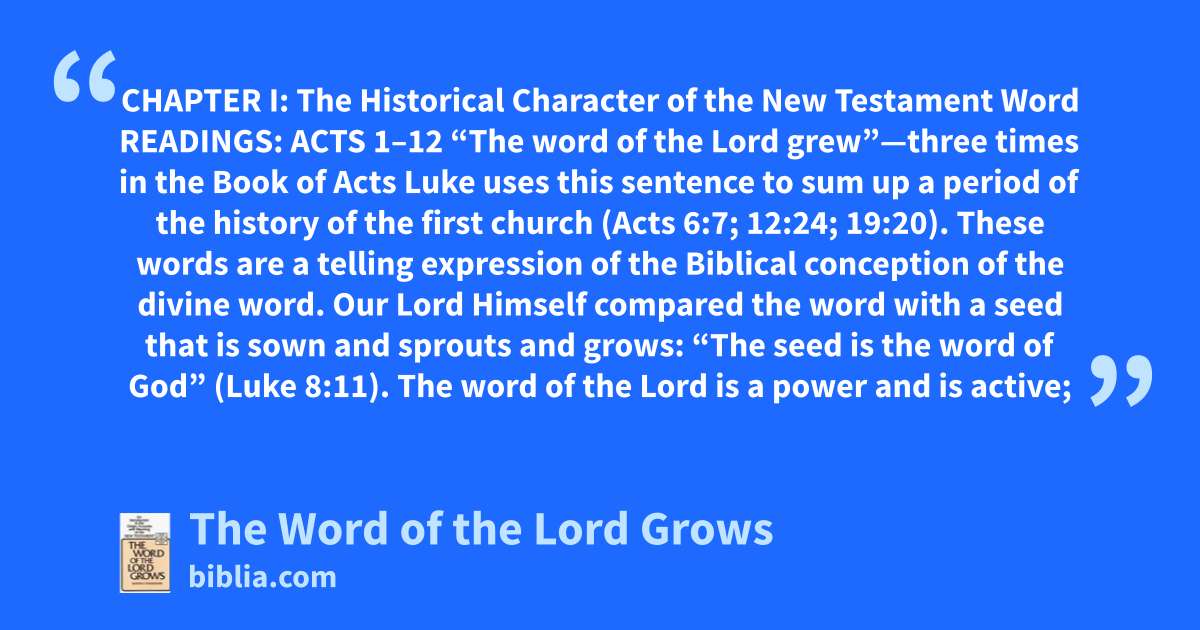 CHAPTER I: The Historical Character of the New Testament Word READINGS: ACTS 1–12 “The word of the Lord grew”—three times in the Book of Acts Luke uses this sentence to sum up a period of the history of the first church (Acts 6:7; 12:24; 19:20). These words are a telling expression of the Biblical conception of the divine word. Our Lord Himself compared the word with a seed that is sown and sprouts and grows: “The seed is the word of God” (Luke 8:11). The word of the Lord is a power and is active;
