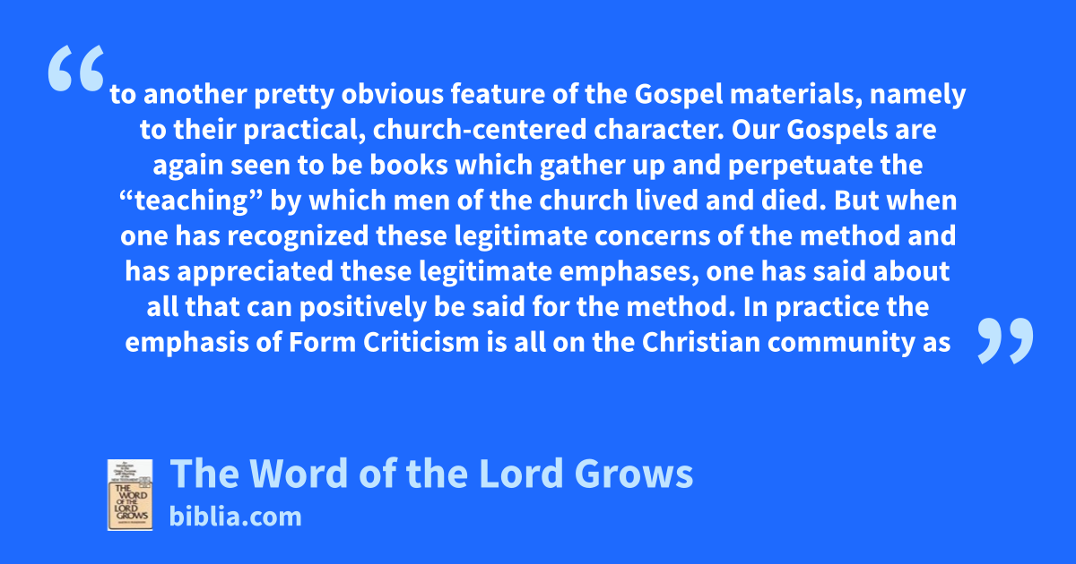 to another pretty obvious feature of the Gospel materials, namely to their practical, church-centered character. Our Gospels are again seen to be books which gather up and perpetuate the “teaching” by which men of the church lived and died. But when one has recognized these legitimate concerns of the method and has appreciated these legitimate emphases, one has said about all that can positively be said for the method. In practice the emphasis of Form Criticism is all on the Christian community as